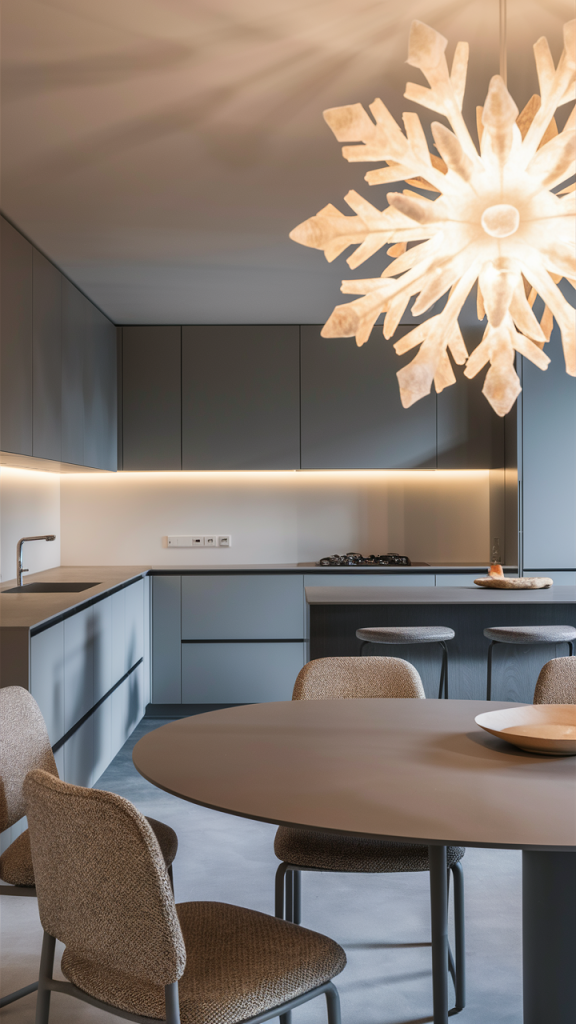 Lighting is the quickest way to elevate your dining area. A bold chandelier, pendant cluster, or sculptural piece centers the room and instantly adds sophistication.