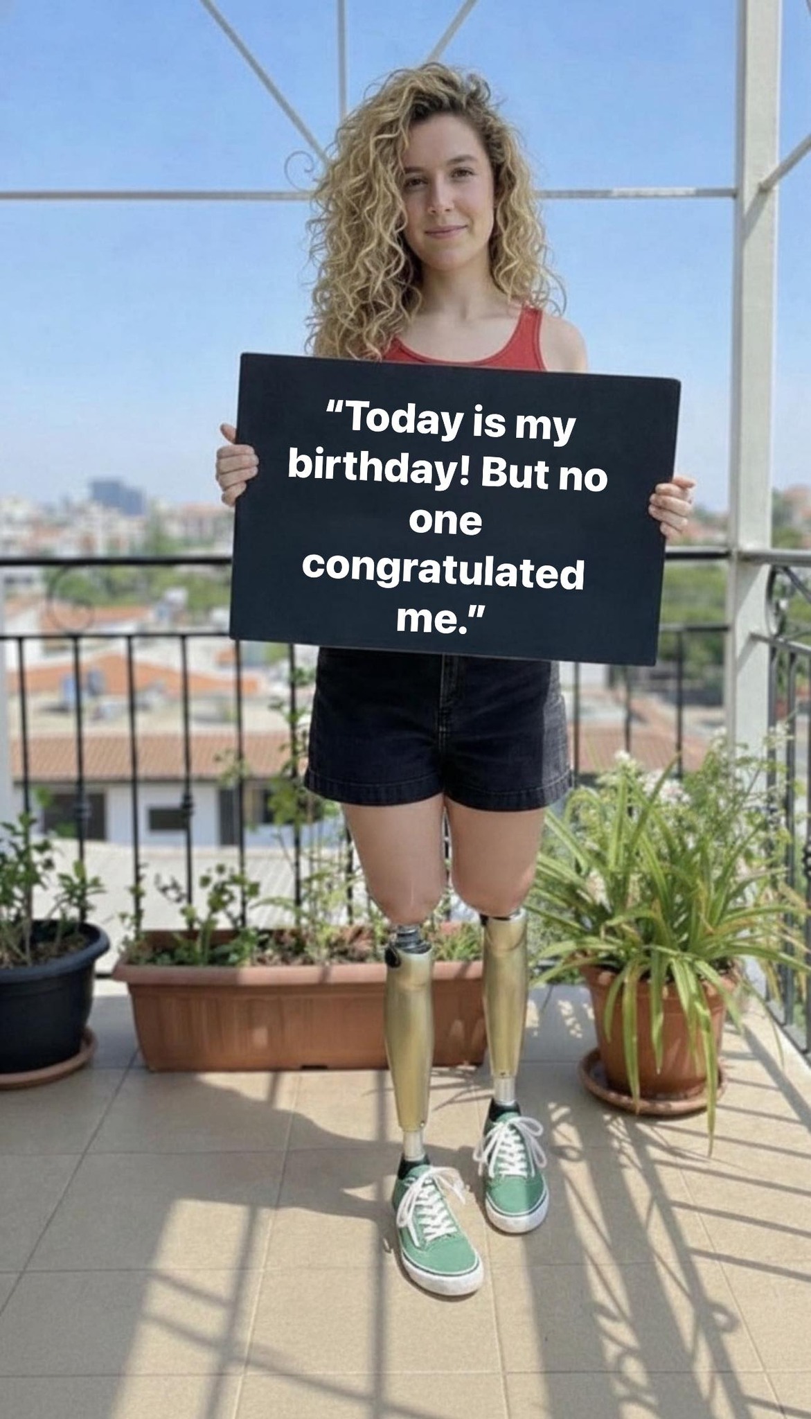 In a world where birthdays are often marked by loud celebrations, endless notifications, and social media attention, one simple image has captured hearts for a completely different reason. It shows a young woman standing confidently on a balcony, holding a sign that reads: “Today is my birthday! But no one congratulated me.”