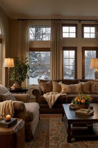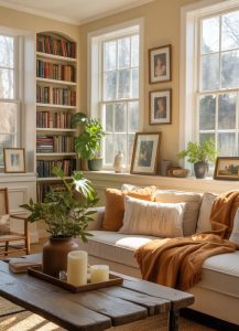 If there’s one feature that defines American coziness, it’s the fireplace. Whether real, gas, or electric, it becomes the heart of a room. Decorate the mantel with garlands, framed family photos, vintage books, or candles to give it that lived-in warmth.