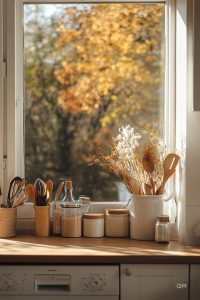 Functional items can double as décor. Cutting boards, wooden spoons, spice racks, and vintage canisters not only serve a purpose but also enhance the kitchen’s visual appeal. Even a stylish fruit bowl or a well-placed plant can add life and color to the space.