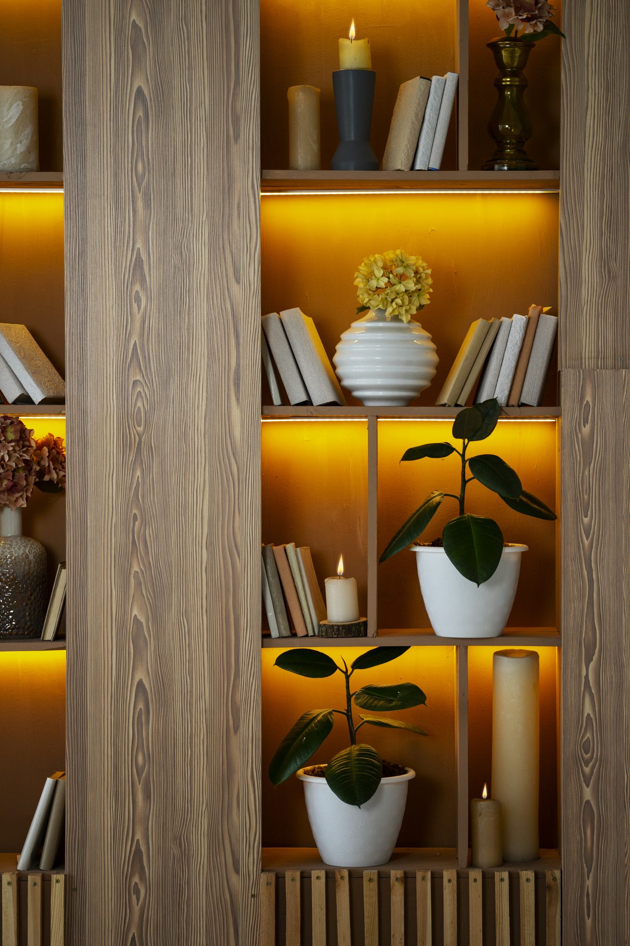 Shelves with built-in lighting enhance both function and ambiance. Soft LED lights highlight books and decor while creating a cozy nighttime atmosphere.