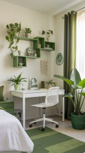 Nothing enhances a green bedroom like real greenery. Snake plants, pothos, and peace lilies improve air quality while tying the room together with natural texture.