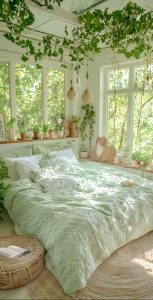 One of the easiest ways to transform your bedroom is with green linens. Whether you choose moss green cotton or patterned botanical prints, it instantly shifts the mood.